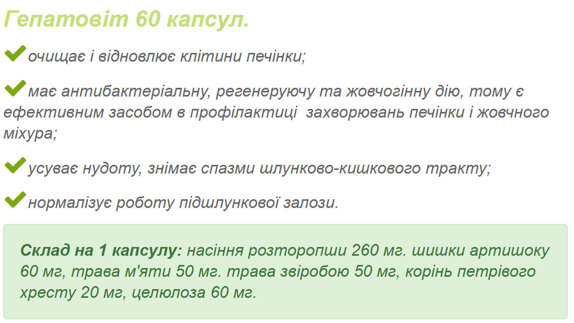 "Гепатовіт" 2 капсули / 2 раза в день за 30 минут до їжі 2 тижні.