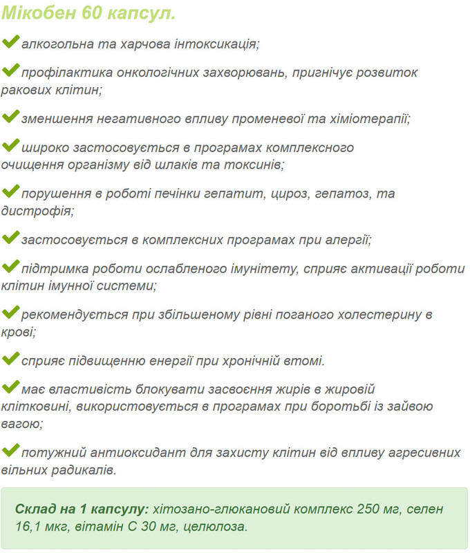 "Мікобен" 2 капсули / 2 раза в день після їжі 2 тижні;